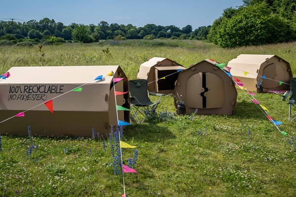 Nous avons collaboré en Angleterre avec EnviroTent, une entreprise qui conçoit des tentes en carton, pour résoudre ce problème urgent. Ensemble, nous avons créé une tente entièrement recyclable, qui pourrait changer la donne contre les "tentes poubelles". Tayla Evans, fondatrice d'EnviroTent, sensibilise les organisateurs de festivals à envisager l'utilisation de tentes en carton.