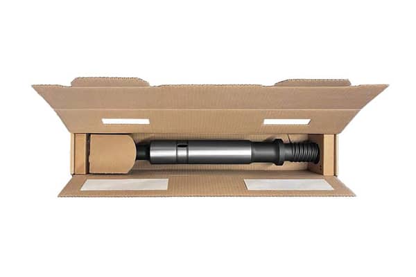 De zware industriële boren en boorschacht-adapters (shank adapters) liggen stabiel en beschermd in de doos, op voldoende afstand van de buitenverpakking. Met een extra tussenlaag kunnen ook kortere boren stabiel worden ondersteund.