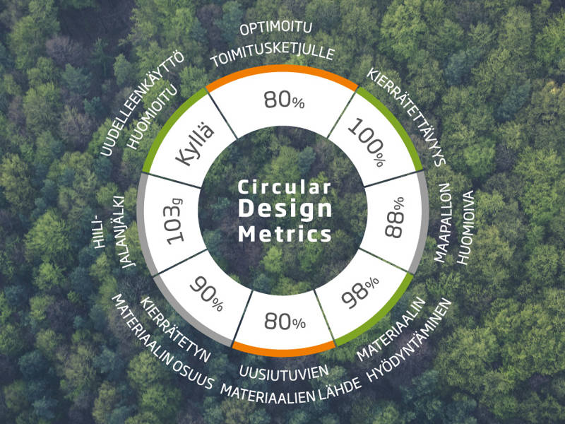 - Hyödyntämällä julkaisemaamme Circular Design Metricsiä, voit helposti verrata vaihtoehtojesi kiertotaloudenmukaisuutta