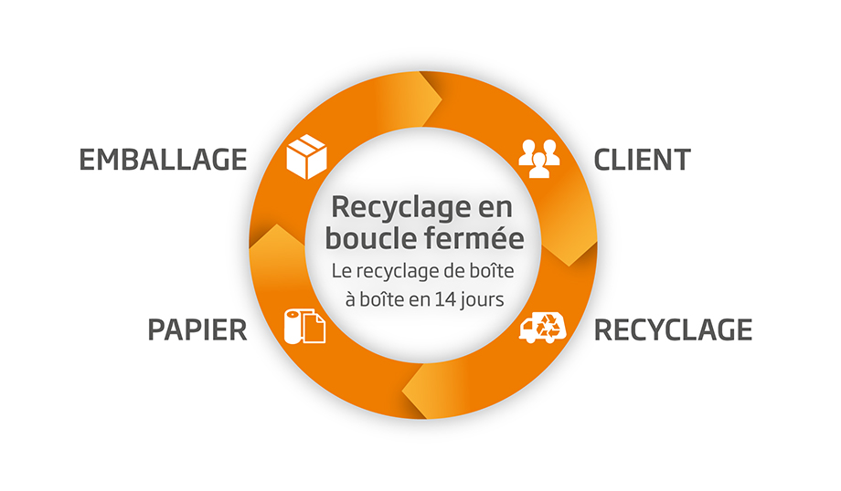 Notre modèle « Boîte à boîte en 14 jours » représente un modèle de recyclage du papier en circuit fermé. Nous fournissons à nos usines de papier recyclé les matières premières de qualité qu’elles transforment en papiers d’emballage recyclés. Ces papiers sont ensuite utilisés dans nos activités d’emballage et transformés en emballages durables.